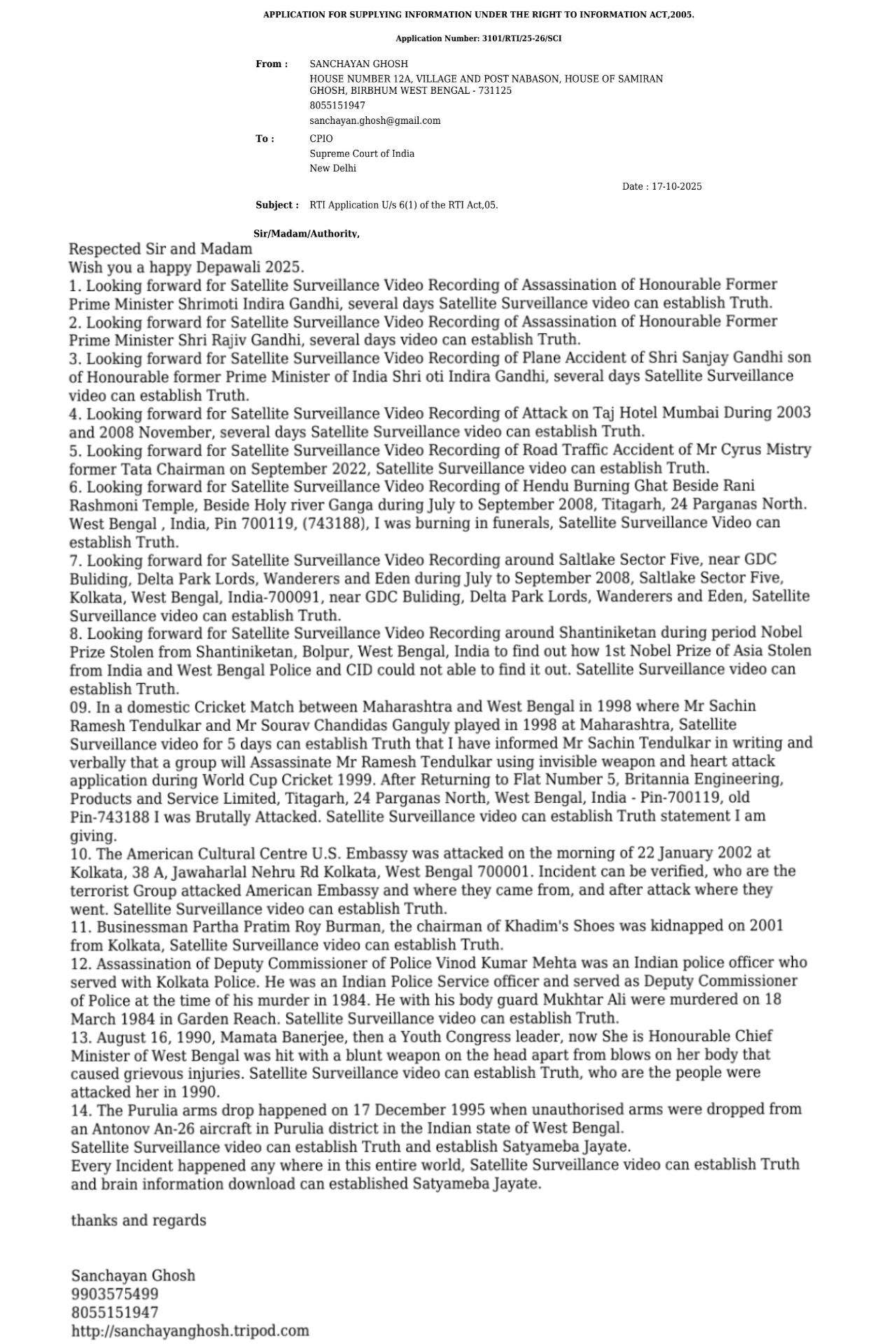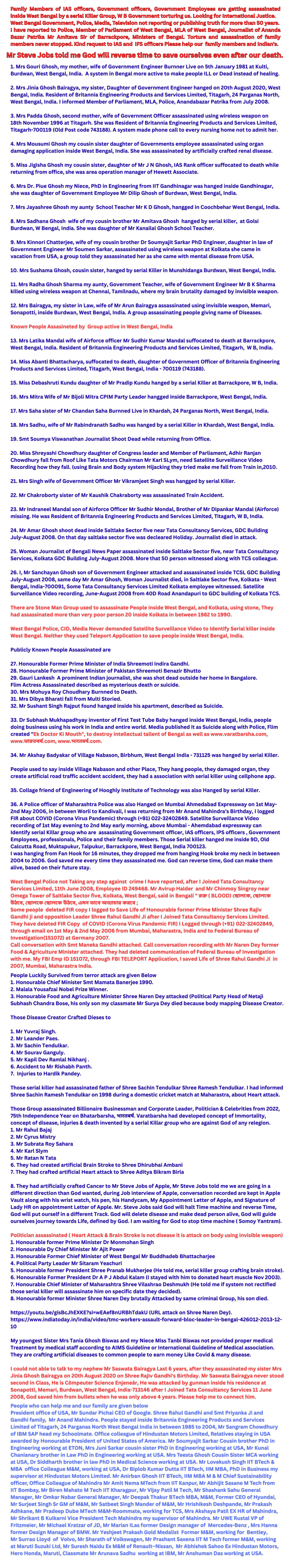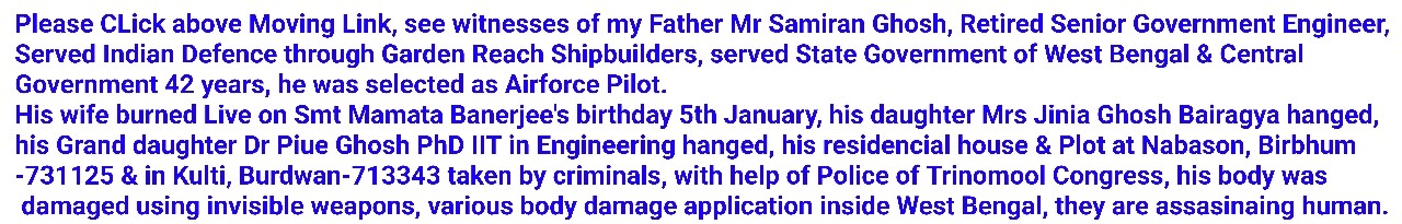 Wittness given by Sr Retired Government Engineer, My father Shree Samiran Ghosh son of Shree Gour Chandra Ghosh, Nabason, Birbhum, West Bengal-India-731125, about attack & assassination of our family members inside West Bengal, India.