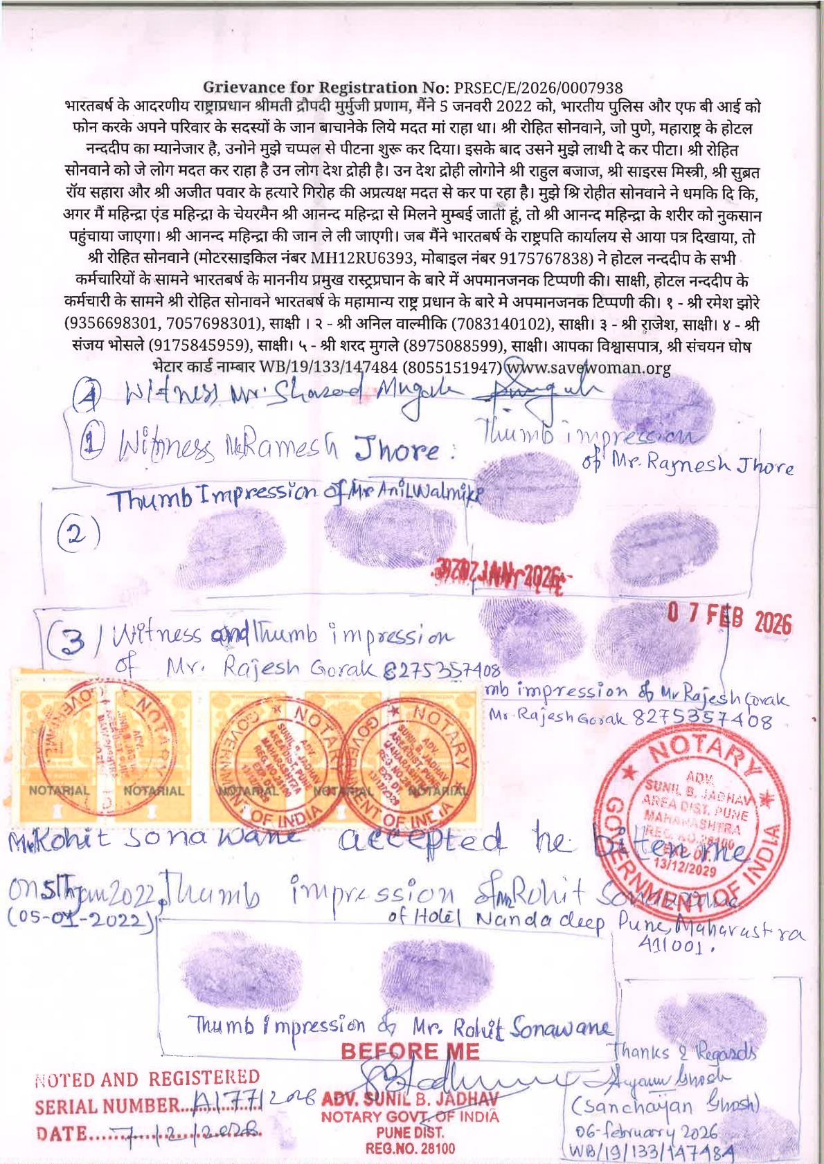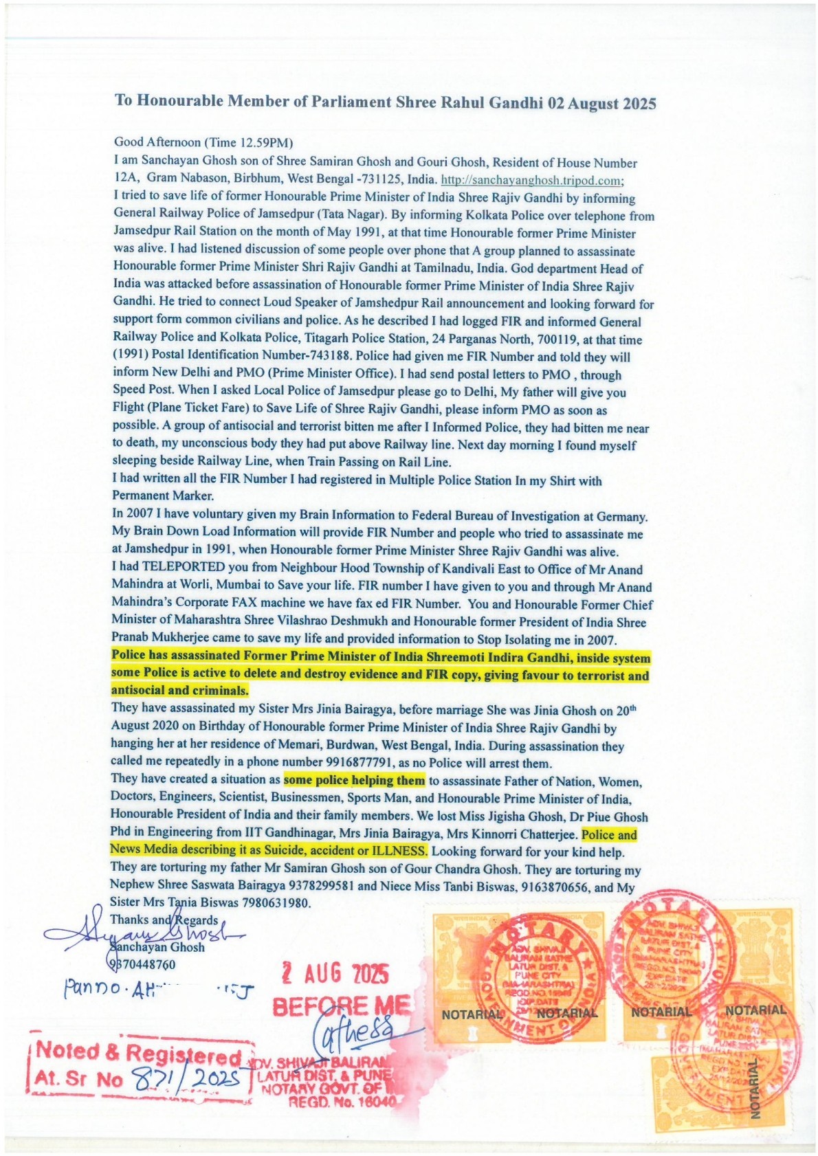 Conversation with Shreemoti Maneka Gandhi ji, I tried to save Life of Honourable former Prime Minister Shree Rajiv Gandhi by Logging FIR at Jamshedpur, Titagarh and Kolkata in the month of May 1991. I saved Life of Shree Rahul Gandhi ji by Teleporting him from Kandivali East to Worli Mr Anand Mahindra's Office in 2007. Please Listen, Press Play Button.