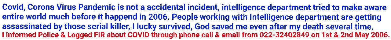 Please read about Corona Virus Pandemic, I had logged FIR about COVID in 2006 from Mumbai from 022-32402849 & in 2007 at Germany (www.järmäny.de) Criminals have isolated me from 2007.